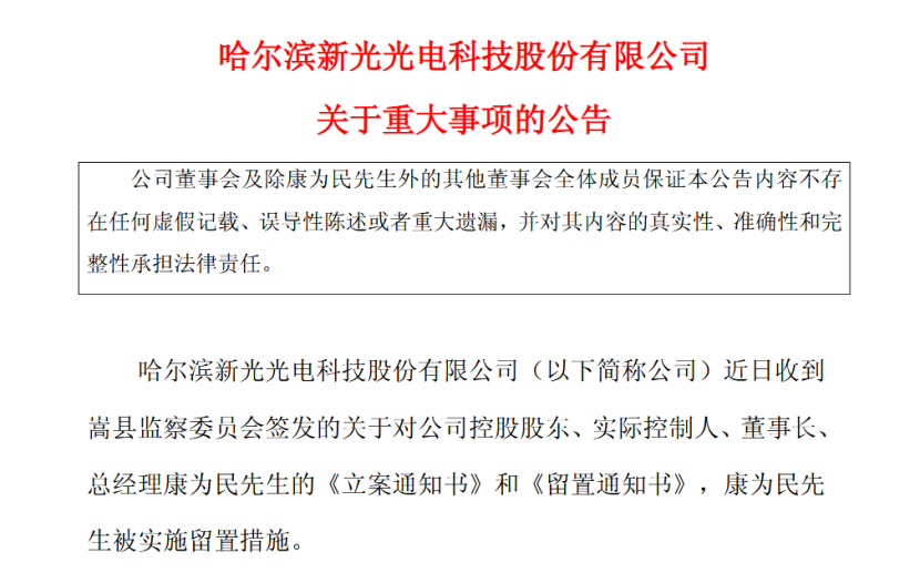 今日(9月28日)晚间,新光光电发布公告,近日收到嵩县监察委员会签发的关于对公司控股股东、实际控制人、董事长、总经理康为民的《立案通知书》和《留置通知书》,康为民被实施留置措施。