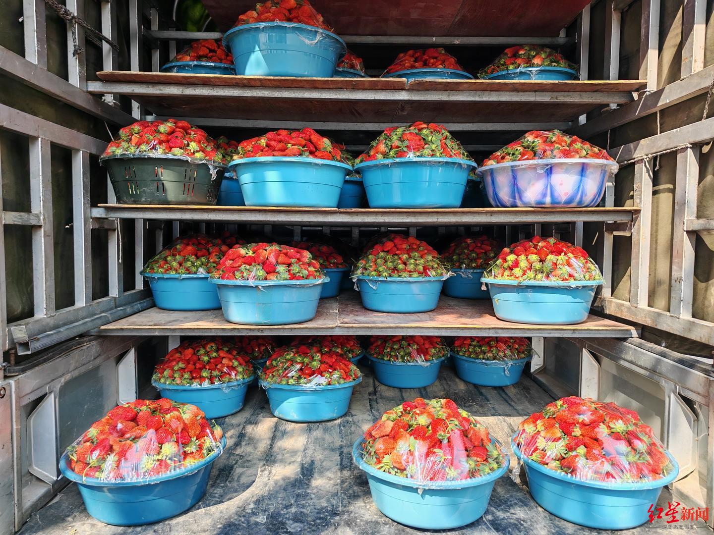 “货车上的草莓都是按盆卖,全是从德昌县拉过来的。”批发商李先生介绍,从春节前一个月开始,他每天都在德昌县收购草莓,再用货车运到西昌的水果批发市场销售。“春节前草莓能卖到十几、二十元一斤,现在批发价就一两元一斤。价格便宜了,销量也跟着大涨,我最多一天能卖8000多斤。但由于批发价偏低,每斤草莓只有几角钱的利润。”