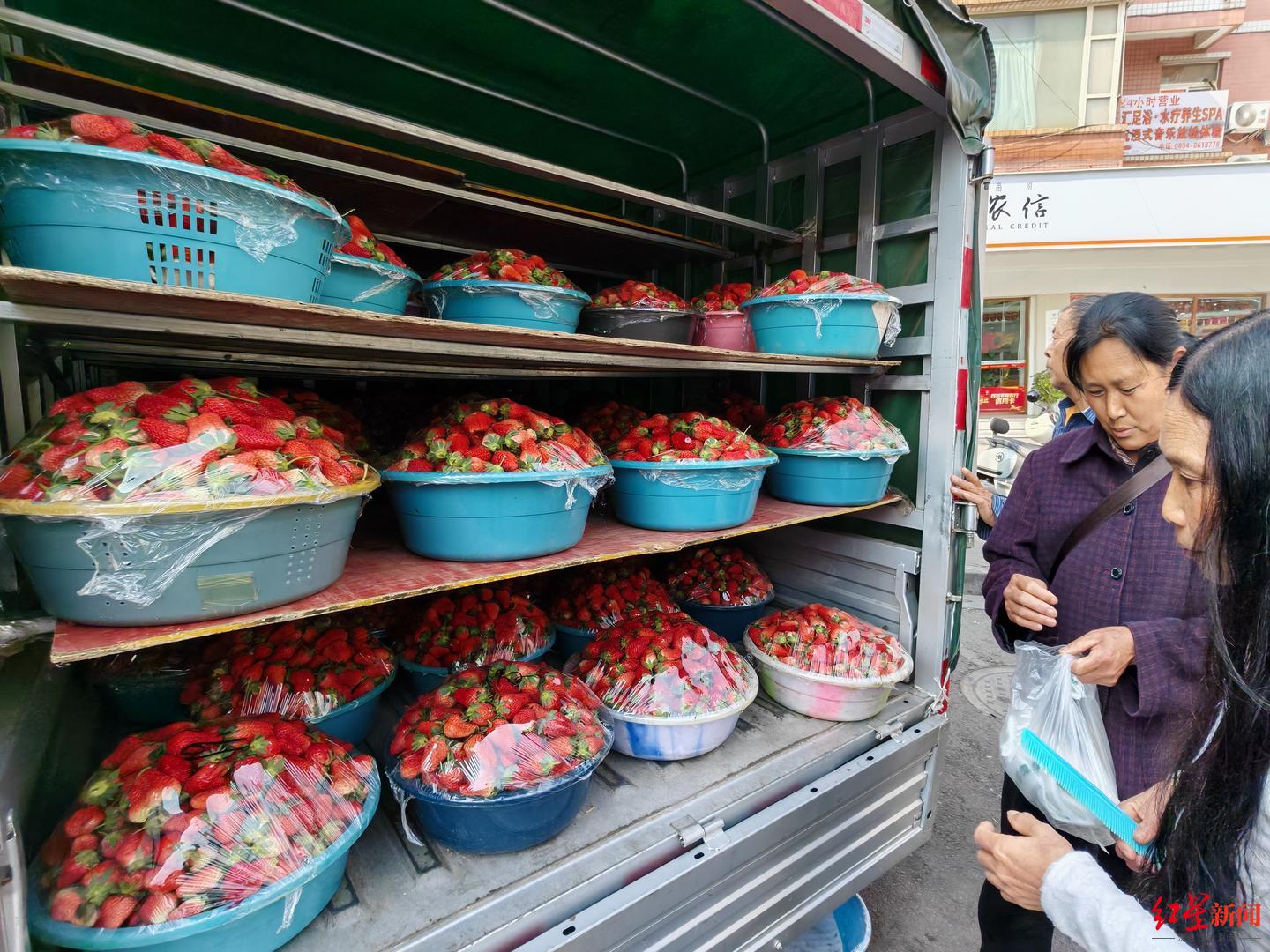 3月6日下午,西昌城南水果批发市场门口,成排货车满载新鲜草莓整齐摆放,吸引了不少消费者前来选购。“现在草莓很便宜,只要2元一斤,一盆10多斤,卖二三十元。”草莓批发商李先生告诉红星新闻记者,若是一次性采购几十盆,价格还能低至1.8元一斤。“市面上零售几元、十元一斤的草莓,大多都是从我们这儿拿货。”
