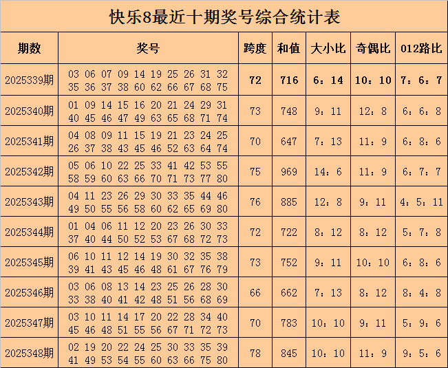 福彩快乐8第2025348期开出奖号:02 19 20 22 24 25 30 33 35 39 41 49 53 54 55 60 63 66 75 80,其中奖号跨度开出78,和值开出845,大小比开出10:10,奇偶比开出11:9,012路比开出9:5:6。