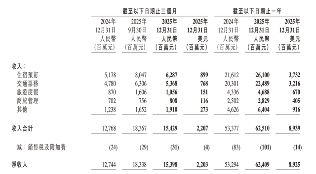 若剔除其他收入的部分,从携程的营业利润来看,2025年第四季度,携程的营业利润约25.34亿元,同比增长10.13%;2025年全年,携程的营业利润约157.73亿元,同比增长11.26%。