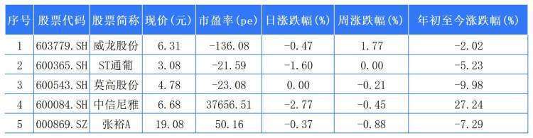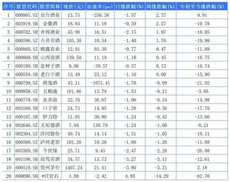 退市倒计时的*ST岩石报收1.08元,日涨幅4.85%(涨停),不过,周涨幅为-14.29%,今年以来涨幅-62.76%,均居白酒A股涨幅末位。
