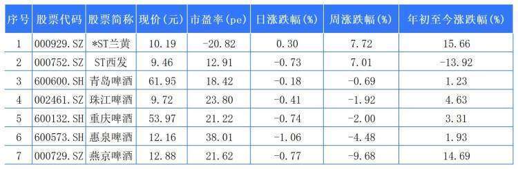 *ST兰黄以7.72%列啤酒股周涨幅第一