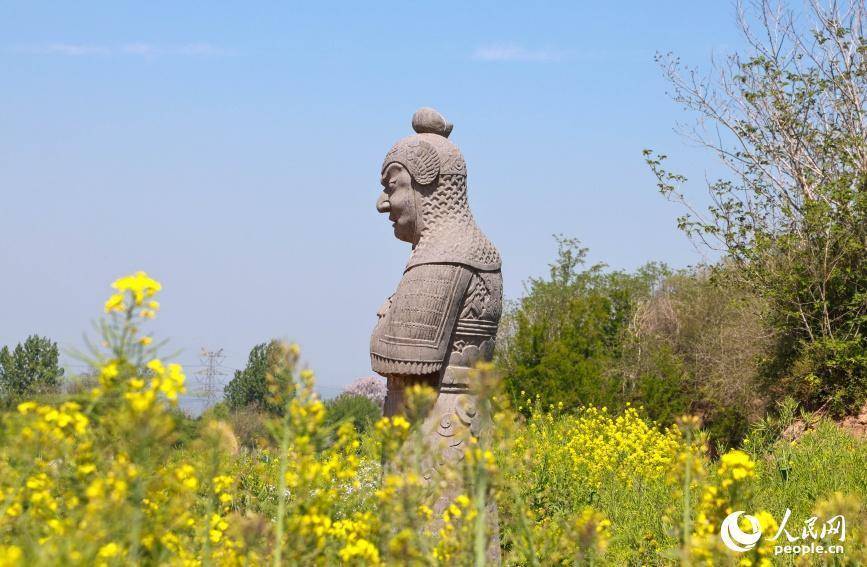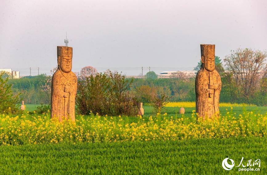 千年宋陵的武臣石刻站在油菜花田之中。人民网记者 戴泽鑫摄