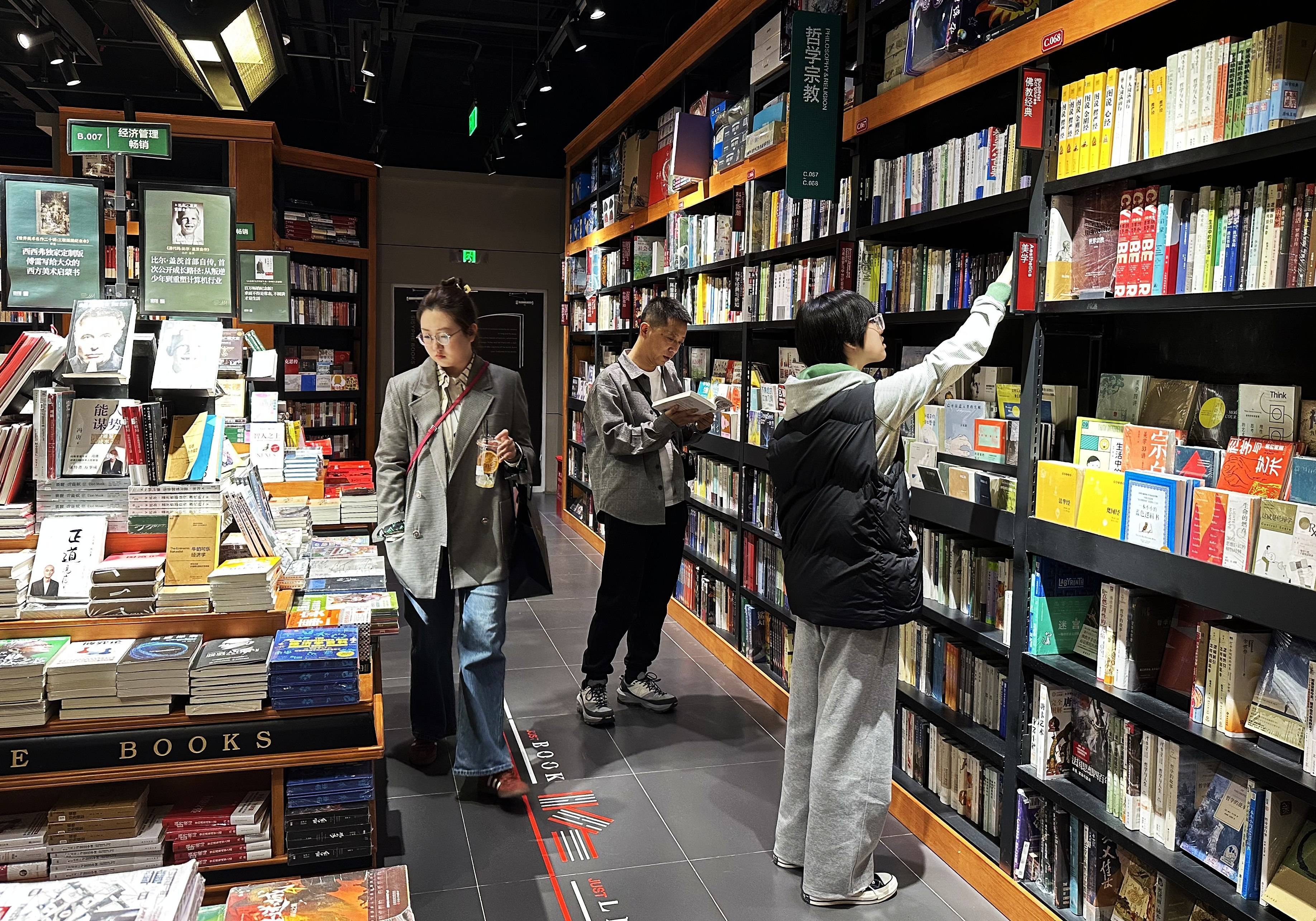 4月18日,长春市民在一家书店挑选图书。新华社记者 司晓帅 摄带着疑问,记者前往多家实体书店寻找答案。长春市安达街巷陌深处的梵墨书画社,十万册旧书在四百平方米空间里错落排布。店主马若梵说,这里的书几乎没有电子版,一壶茶、几本书,读者在此淘书、静读,期待与书的作者来一次“精神邂逅”。